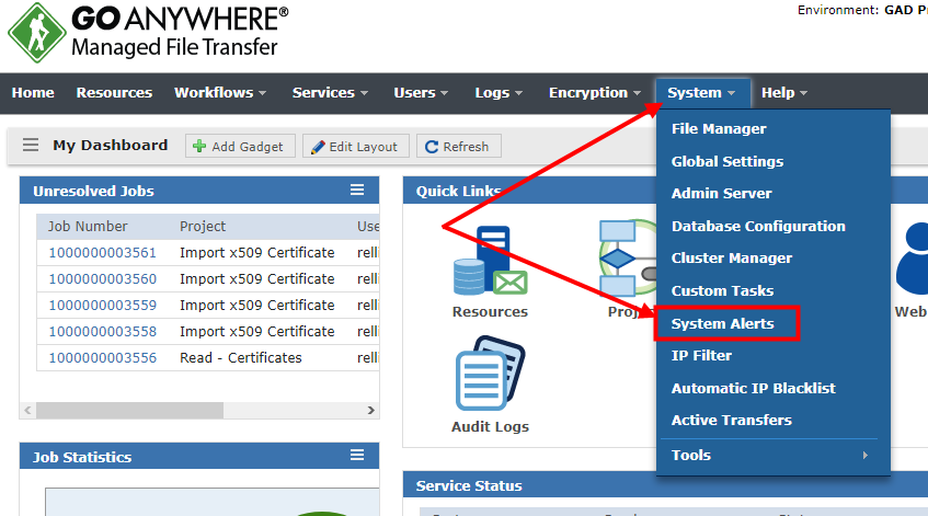 There are no “triggers” or “monitors” that must be defined or identified. GoAnywhere will automatically send these system alerts to the email addresses associated with the defined Admin User role, or the implicit email address for you.