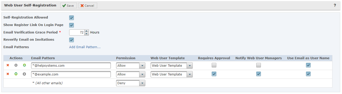 2. The email address pattern under Self-Registration does not allow invitations to or from the domain of the web user who attempted to share (or invite) the folder.