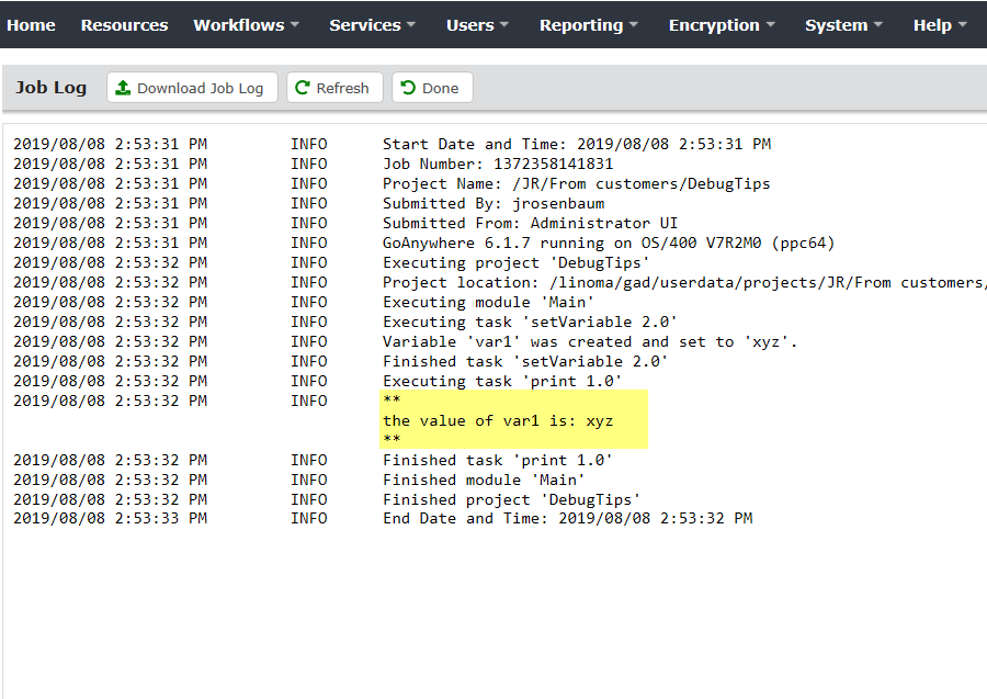 When you execute the project, it will be displayed in the job log.
