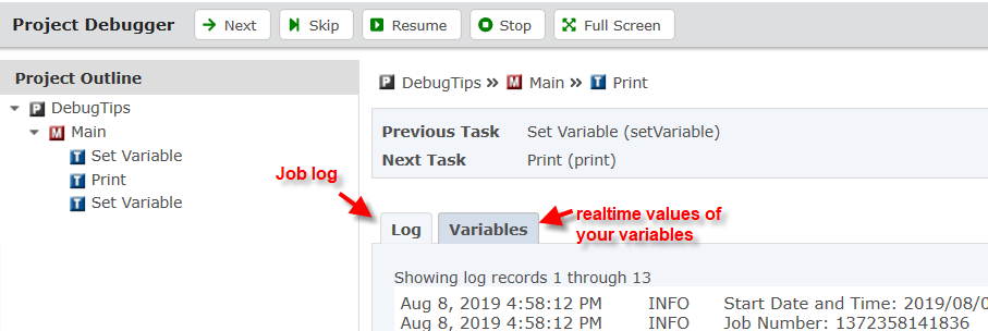 To test your logic, click on the “Debug” button to step thru your project one task at a time.